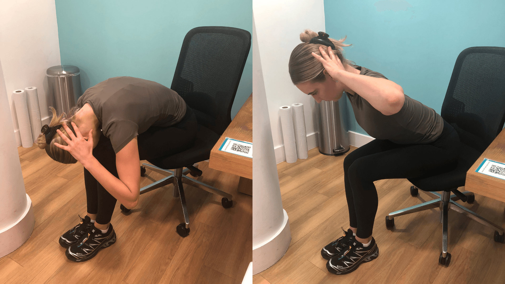An easy one for your back, hips and neck. Seated in your chair (you can also do it standing), bend forward and touch your toes. Then with hands on head, push your chest forward and arch your mid-back. Continue these continuously for 60 seconds.