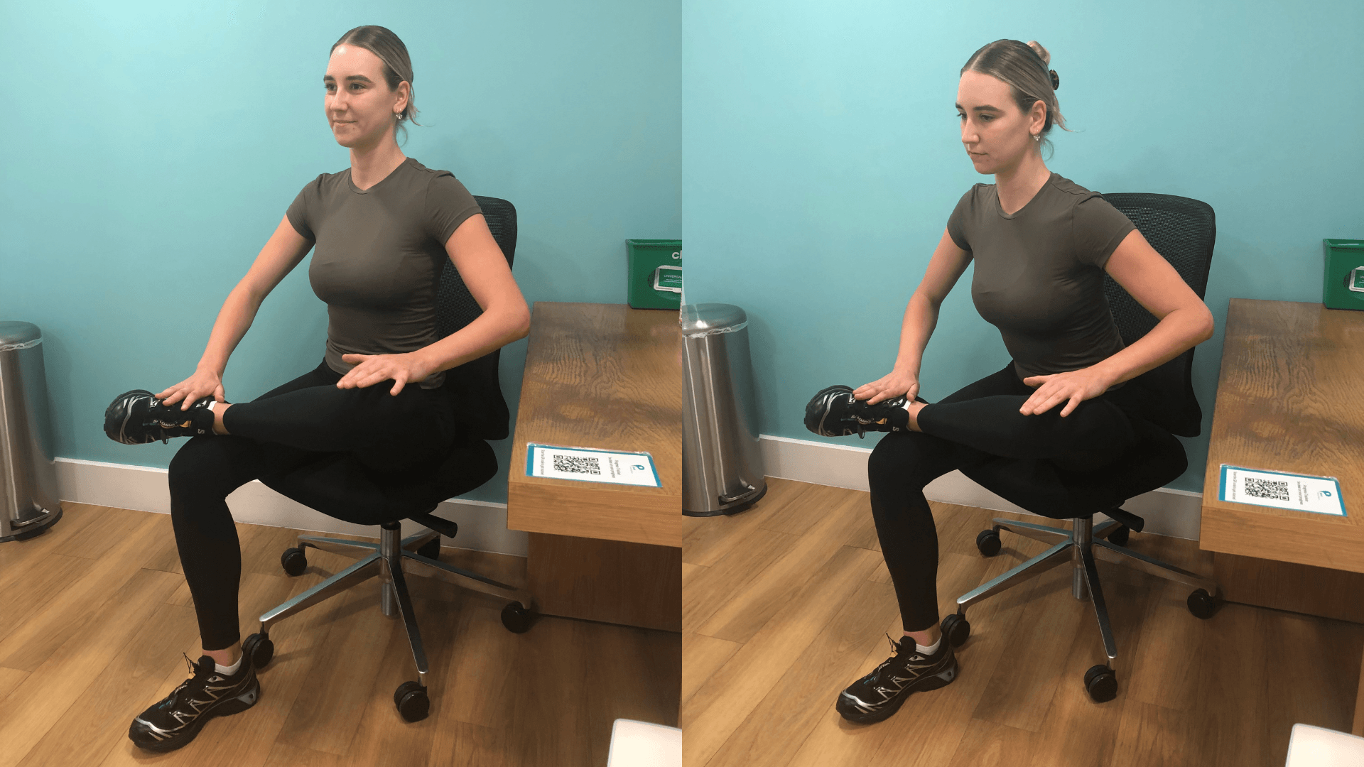 Start with your feet flat on the ground. Place your left ankle on your right knee. Then, gently press into your left knee with the hand and hinge forward from the hips.