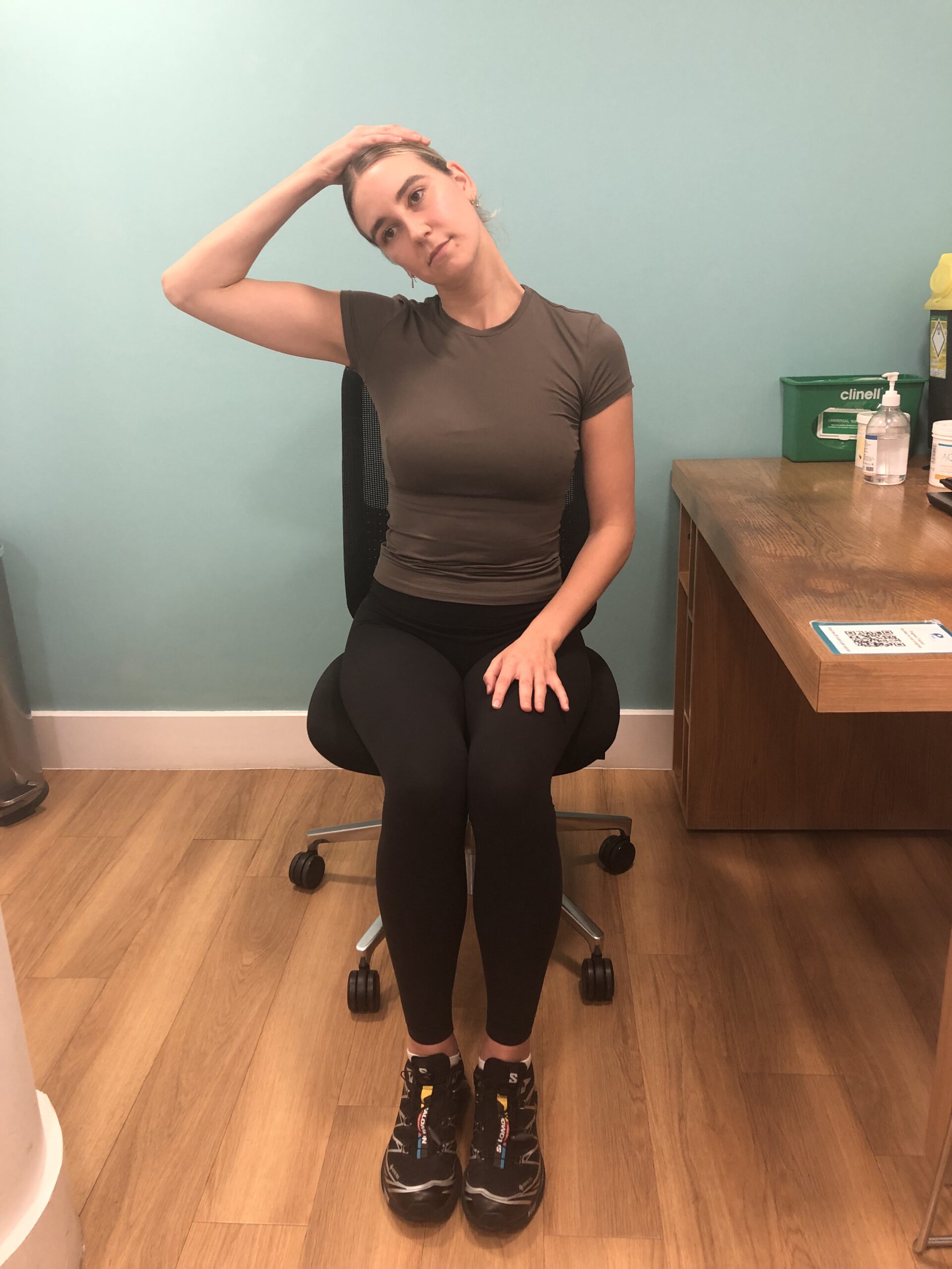 In standing or sitting, place one hand on your head and bend the opposite way. Repeat one way for 60 seconds and the do the same on the other side. A great movement for your back, neck, ribs, and trunk.