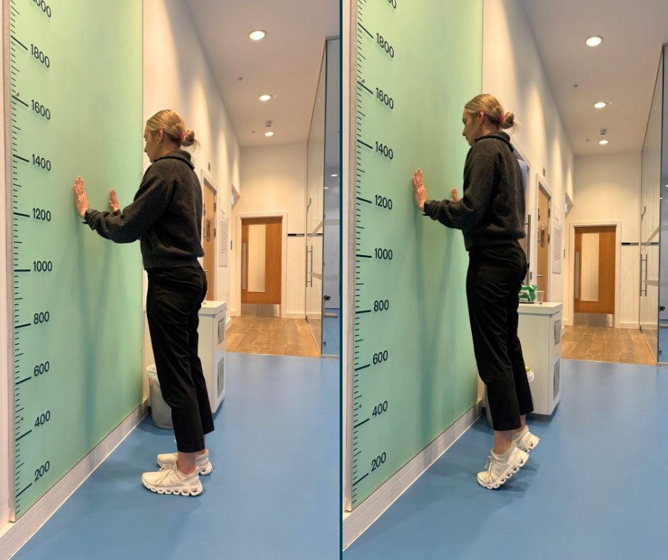Foot flat and straight. Touch your knee to the wall. Move your toes back whilst maintaining knee contact and measure the final distance of your big toe from the wall.
