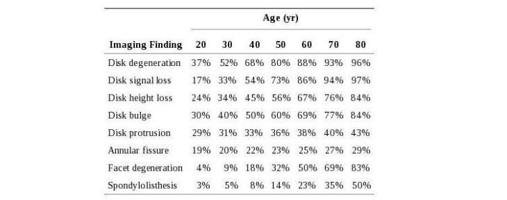 Age specific prevalence estimates of degenerative spine imaging findings in asymptomatic patients: